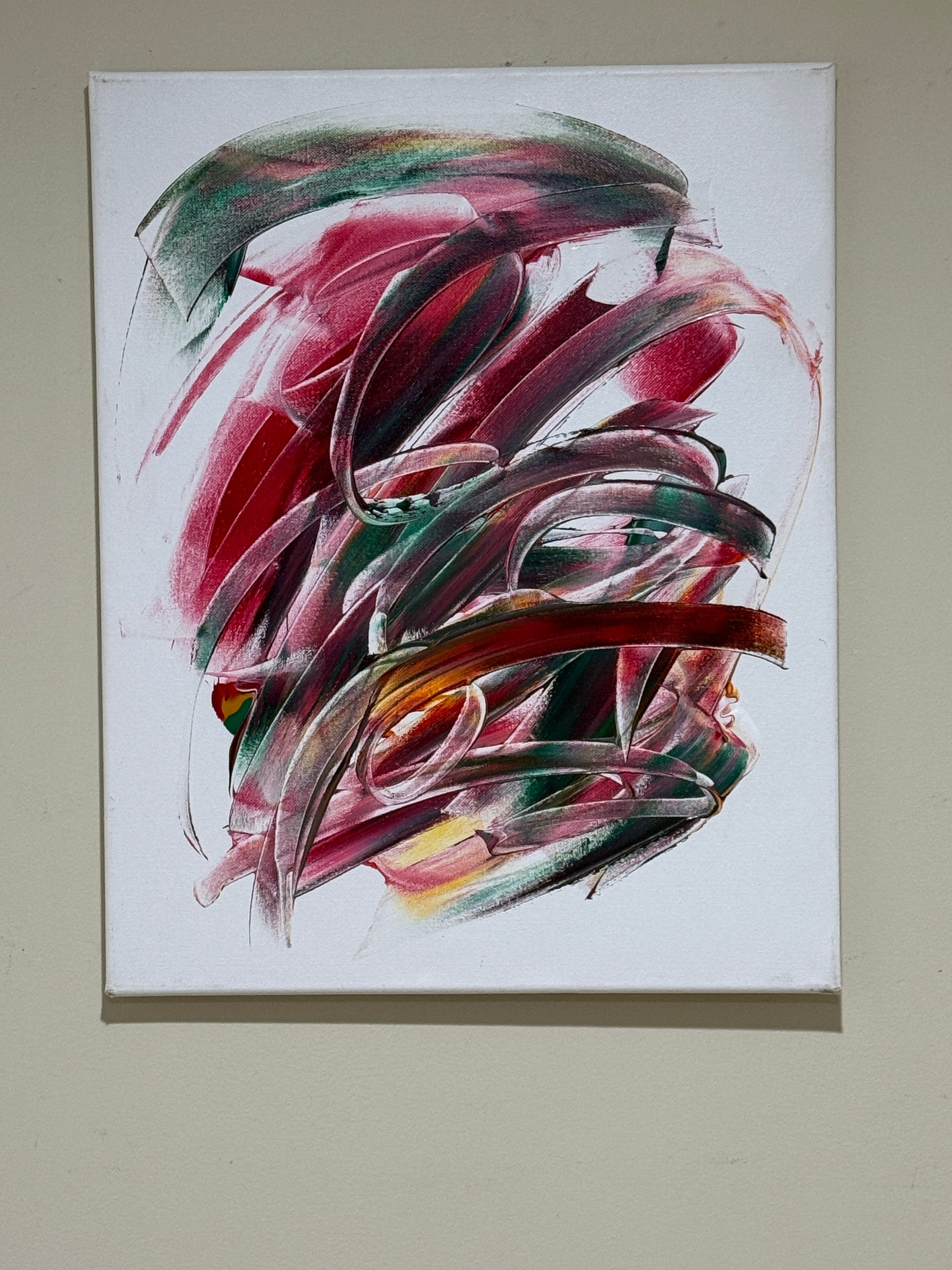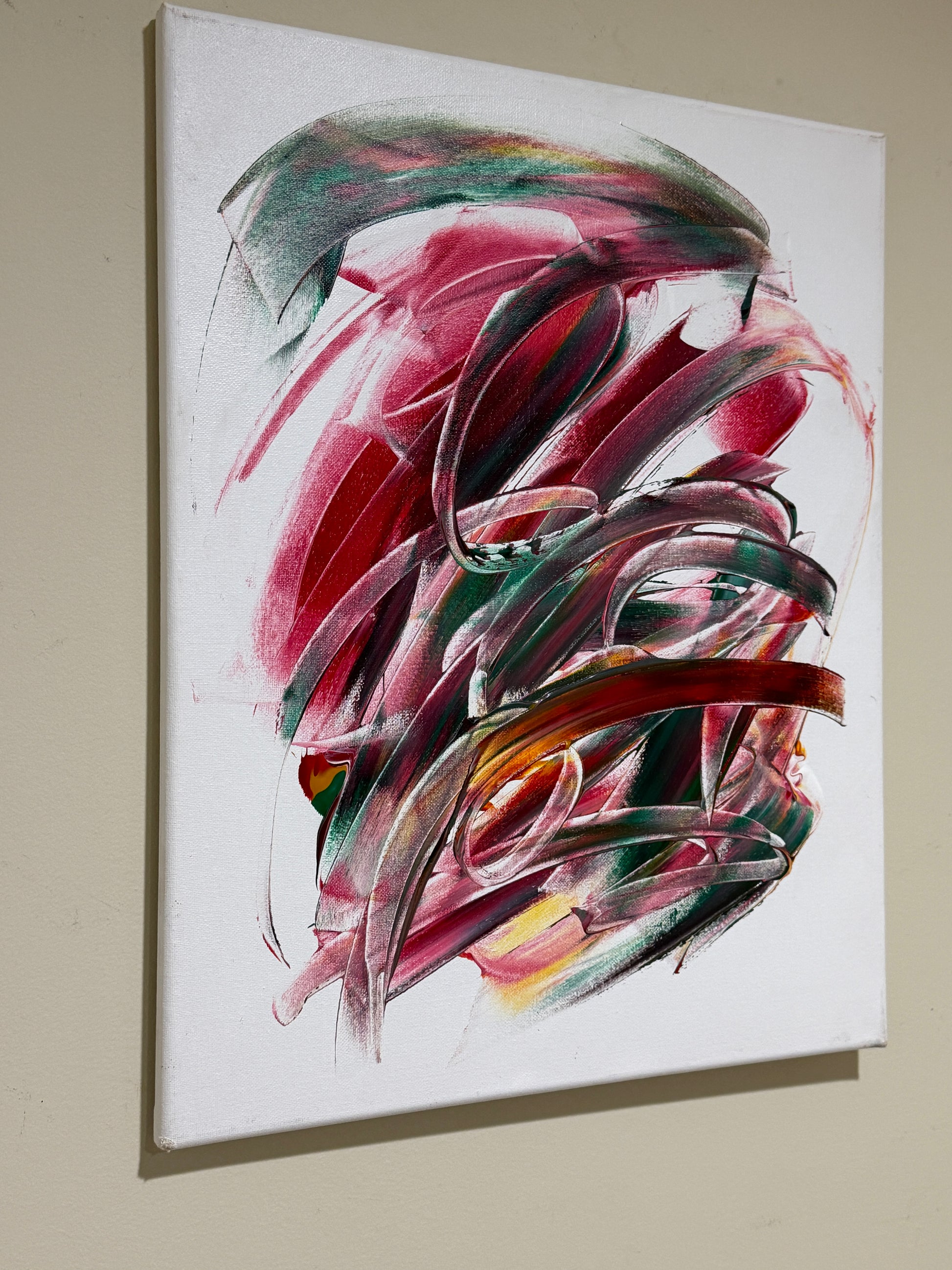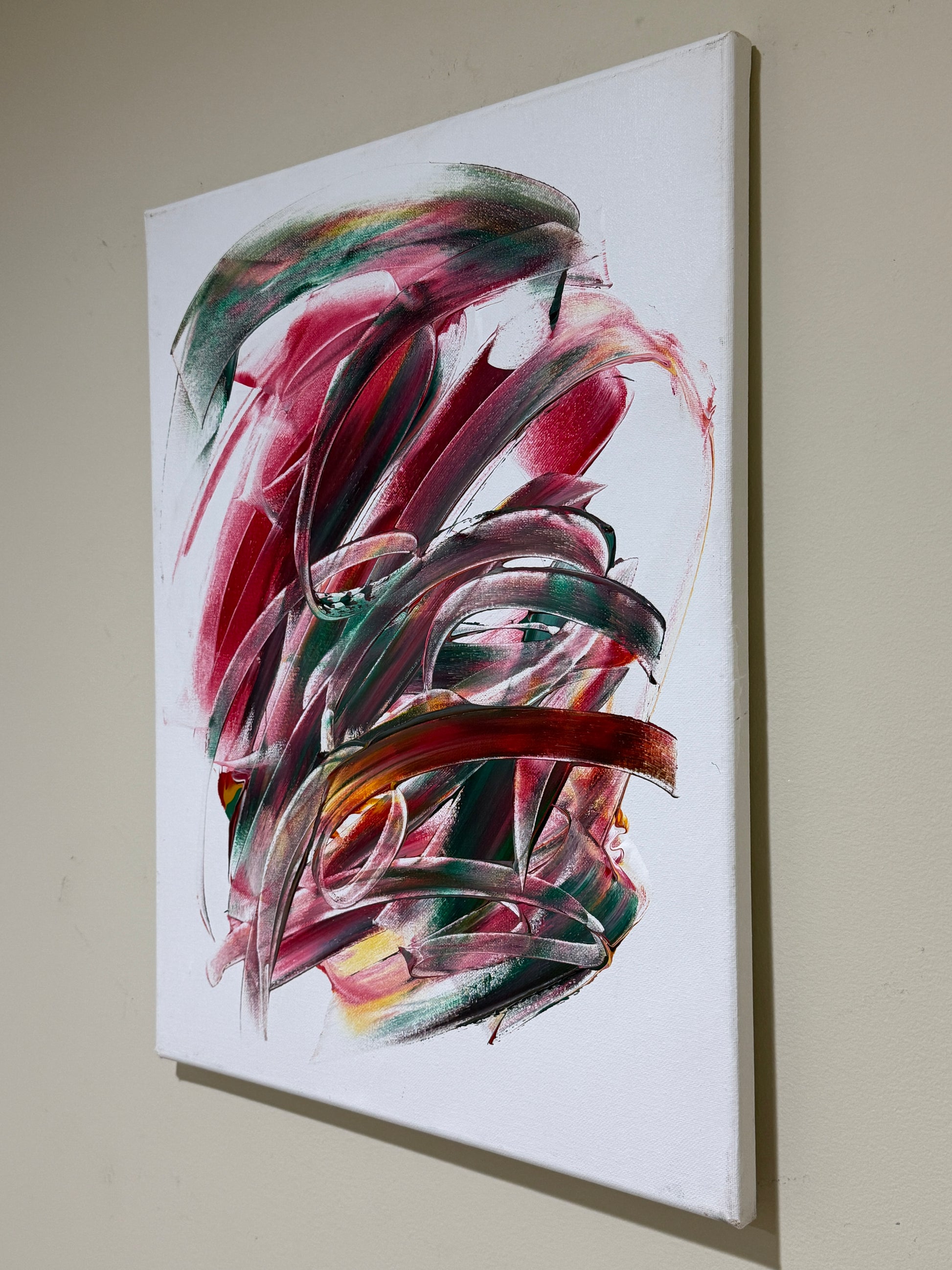 Bring bold energy and modern elegance into your space with Crimson Currents, an original abstract acrylic painting. Featuring dynamic strokes of crimson, emerald green, and golden undertones, this piece evokes movement and emotion in every curve. Perfect for living rooms, offices, or art collectors seeking a statement piece.
