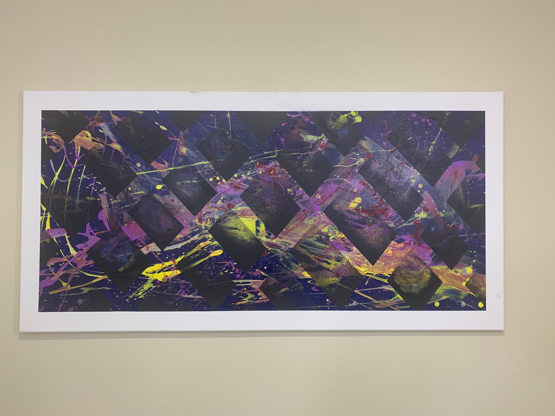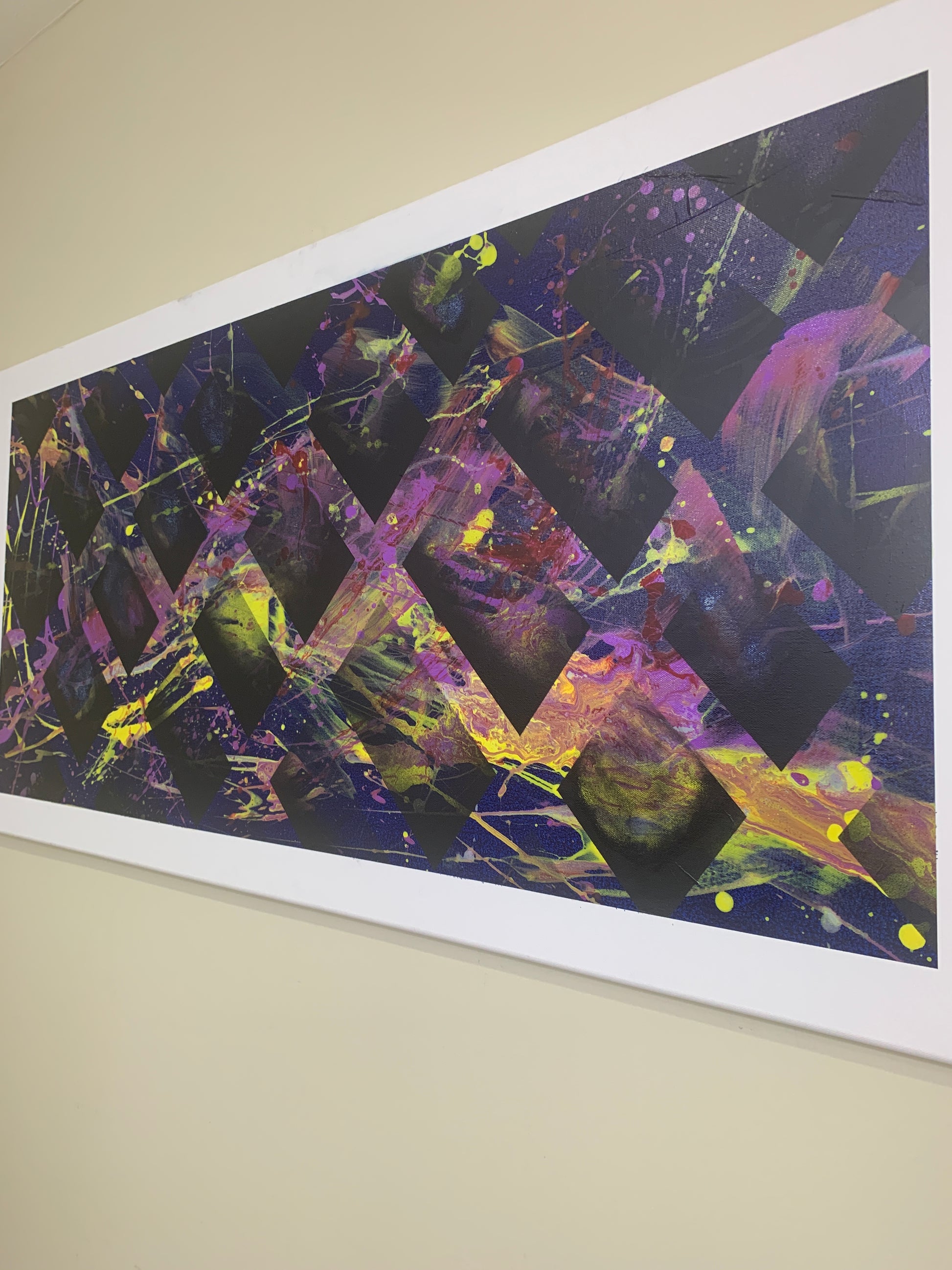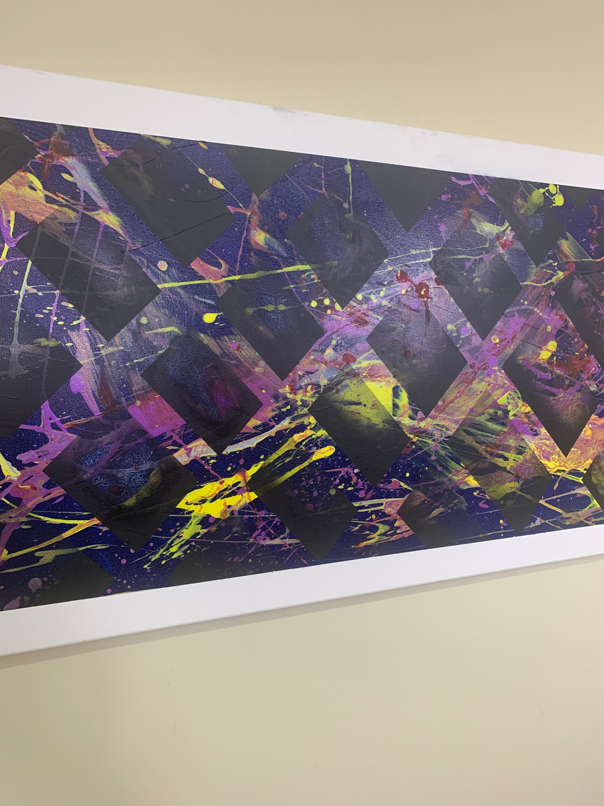 Step into a world of bold contrasts and enigmatic beauty with "On the Dark Side," a 24x48 abstract masterpiece that fuses expressive energy with refined mystery. A lattice of near-black diamond shapes anchors the composition, while splashes of electric yellow, vivid pink, and deep purple streak across the canvas in a vibrant dance of color and texture. The result is a dynamic visual experience that evokes depth, movement, and intrigue.