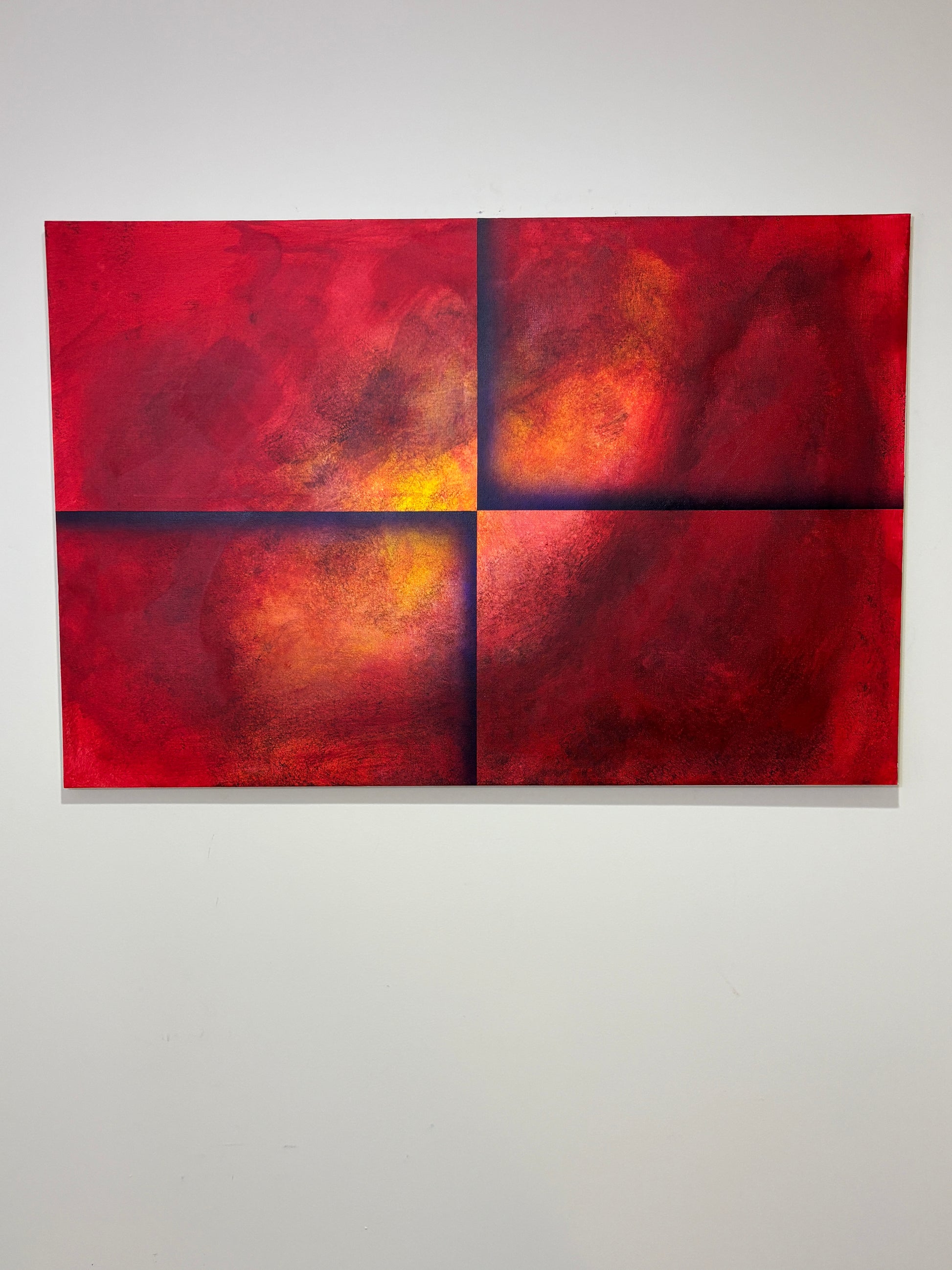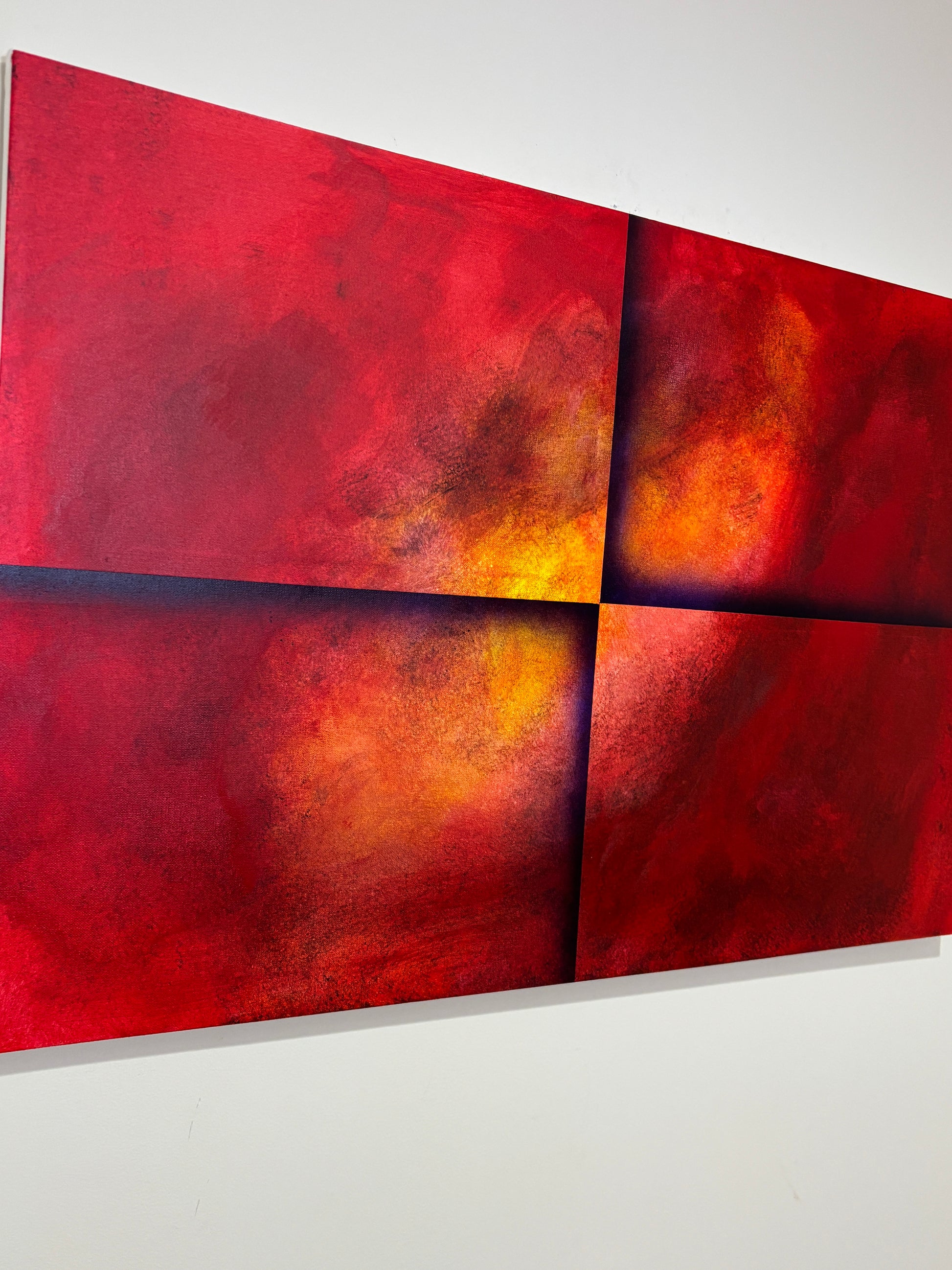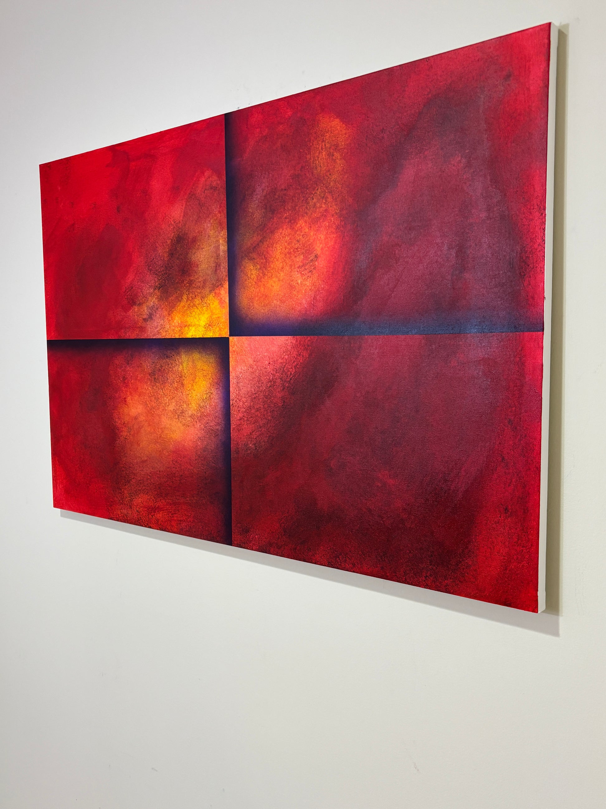 One Tin Soldier is a bold and evocative abstract painting that commands attention with its dramatic use of color and form. Divided into four striking quadrants, the canvas pulses with deep reds, fiery oranges, and glowing yellows, all layered with rich shadows and gradients that create a powerful sense of depth and motion.