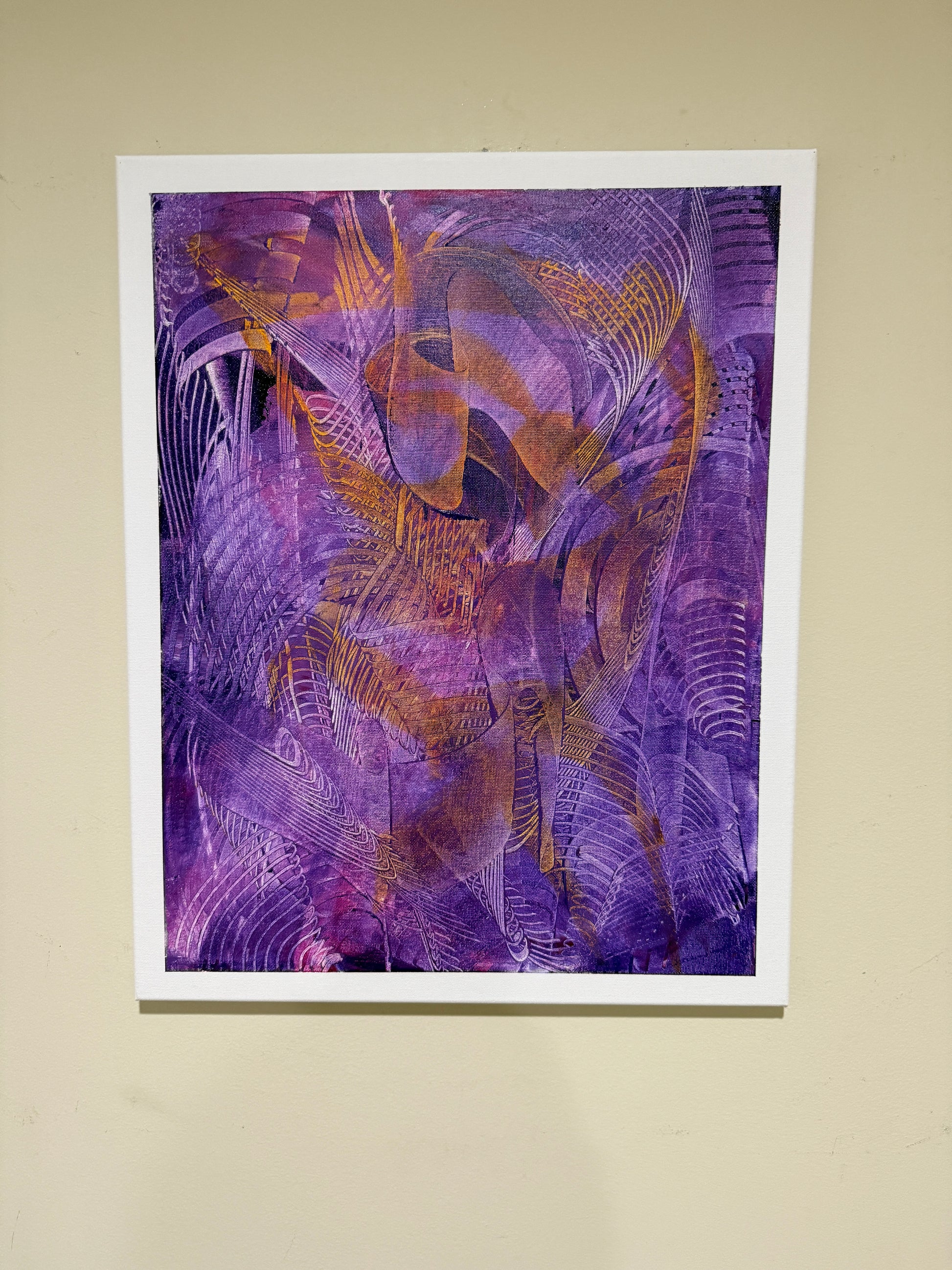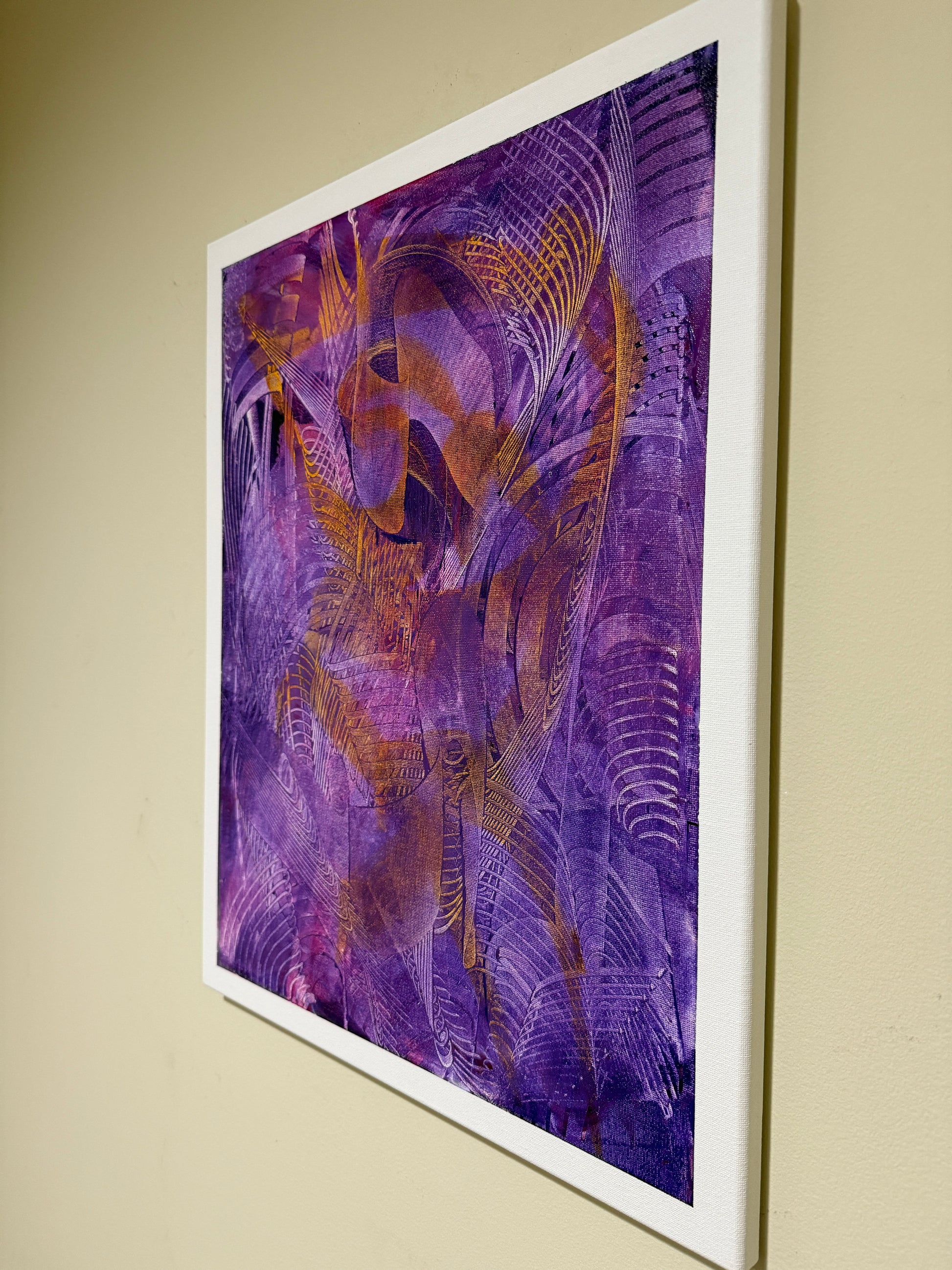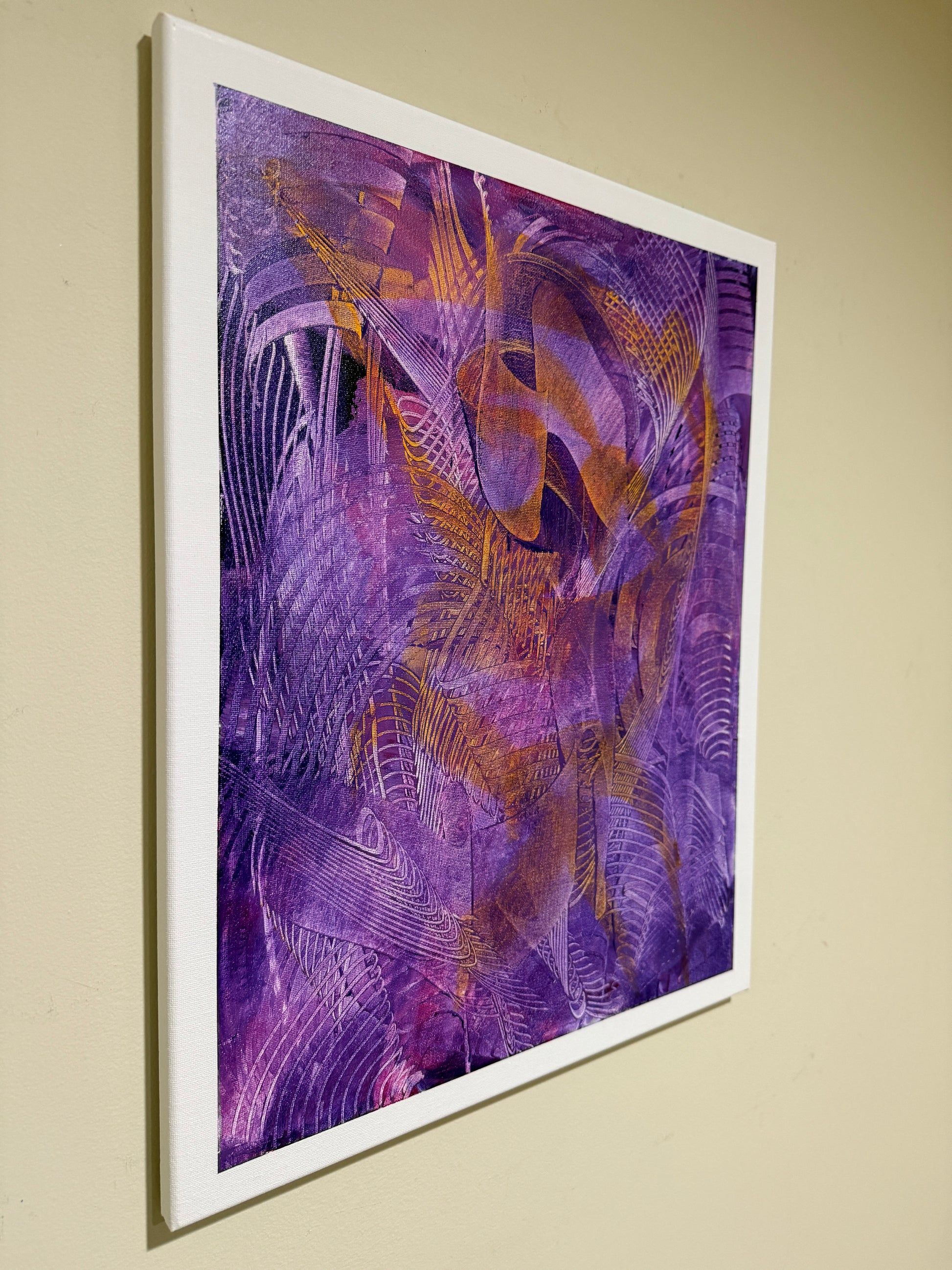 Immerse yourself in the evocative beauty of "Reminiscing", a captivating abstract that blends rich purples with warm golden hues in a dance of texture and emotion. This 16x20 acrylic on canvas invites introspection, with layered patterns that echo the complexity of memory and the warmth of nostalgia. Whether displayed in a gallery, home, or office, this piece offers a timeless elegance and a personal journey—each glance revealing new depths and hidden stories. A perfect addition for collectors and dreamers alike. 16x20 Acrylic on Canvas