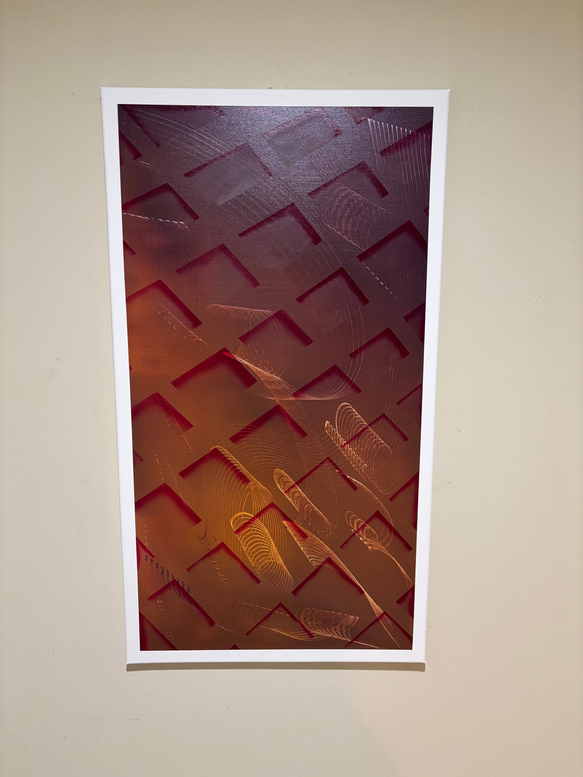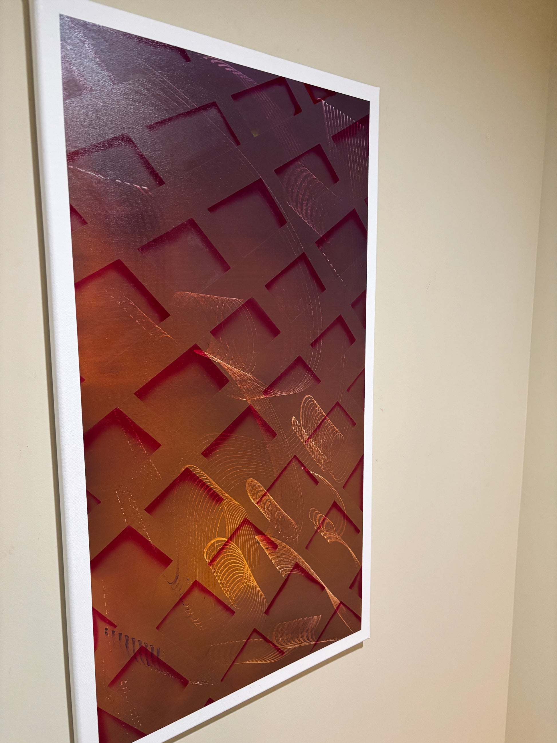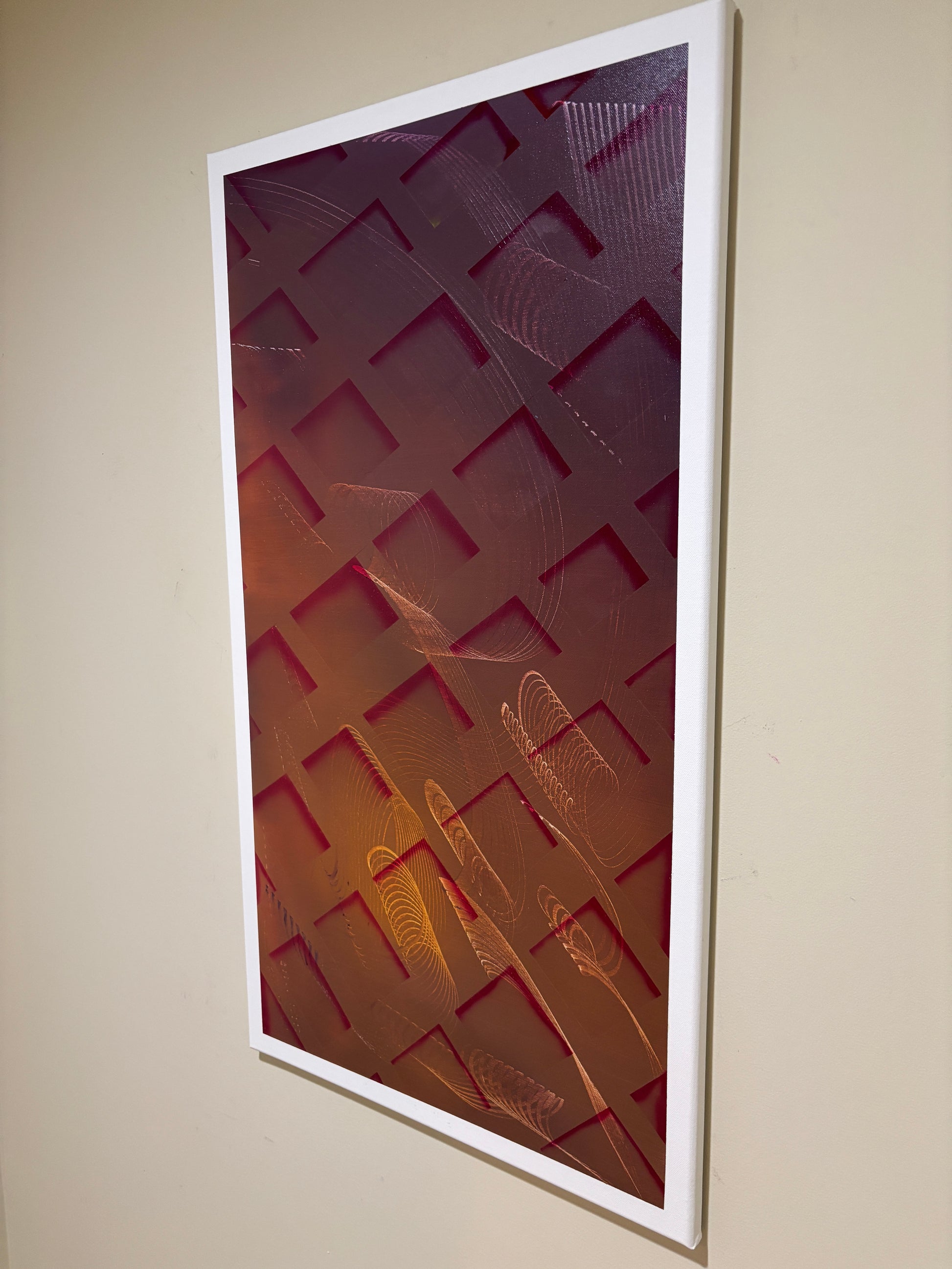 Ignite your space with the warmth and mystery of "Smoke from a Distant Fire", a striking acrylic painting that commands attention. Measuring 20x36 inches, this piece radiates with a rich gradient of deep reds and fiery oranges, evoking the mesmerizing glow of a distant blaze. Geometric patterns etched into the textured canvas add layers of depth and intrigue, while delicate wisps of smoke-like lines drift across the surface, suggesting movement and hidden stories.